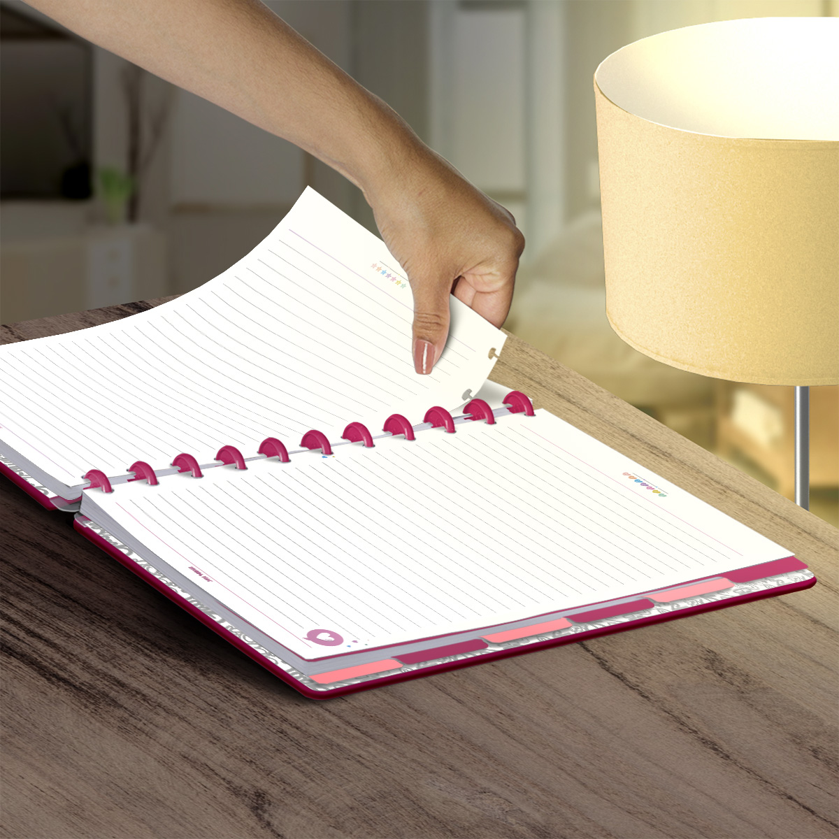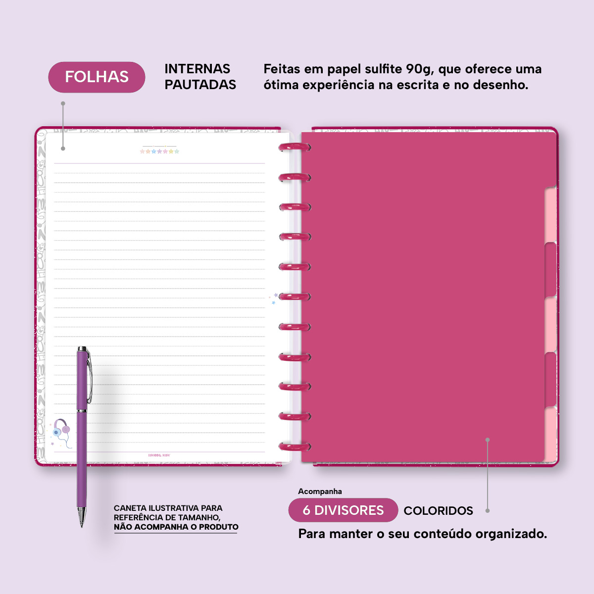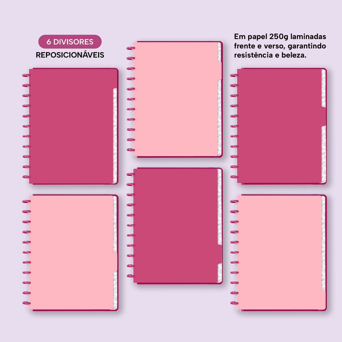 A capa é dura, com impressão digital de alta definição, e acompanha 4 ou 6 lindas divisórias que você pode colocar em qualquer local do caderno, funcionando como o guia perfeito para sua organização.