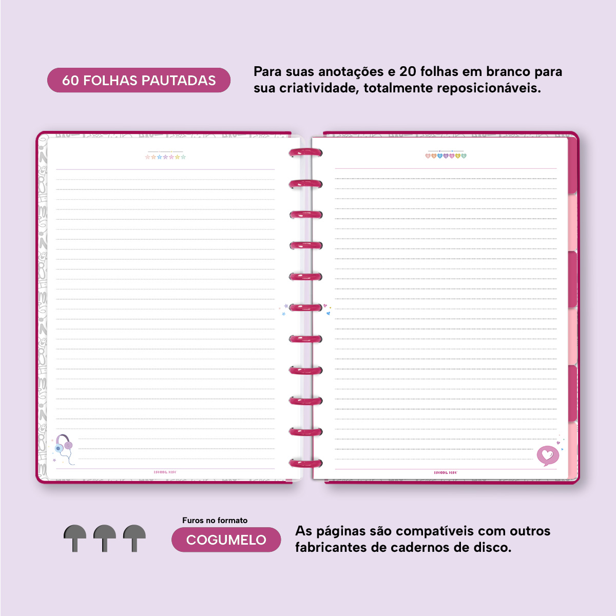 O miolo conta com 60 ou 120 folhas pautadas decoradas, em papel sulfite 90 g (aquele papel mais “grossinho”), para que você use e abuse das suas canetas especiais, e 20 folhas em branco, ideais para explorar seu lado mais criativo ou até imprimir nelas.