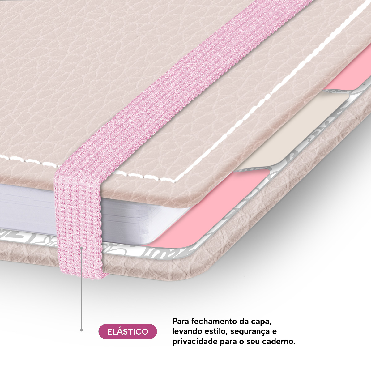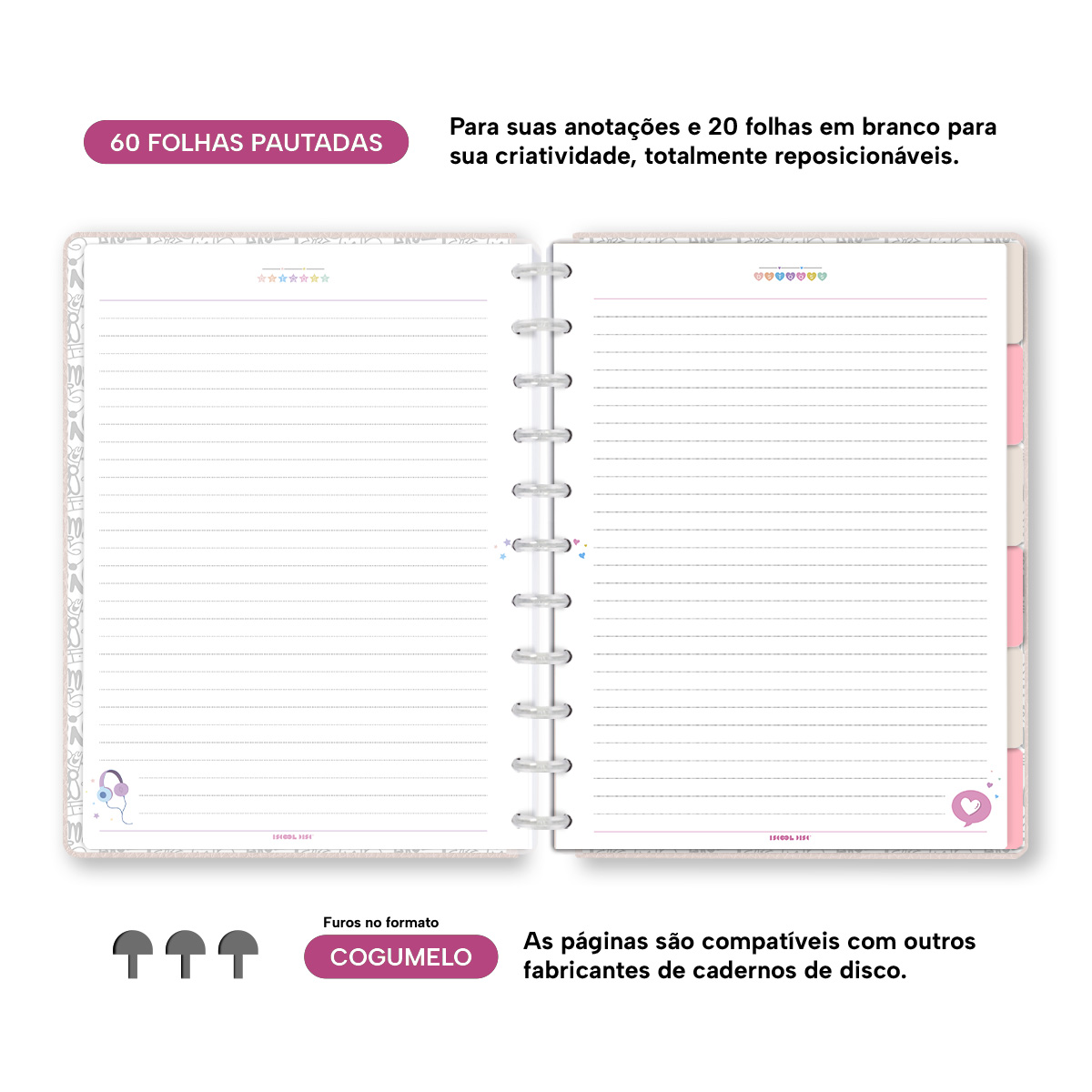 O miolo conta com 60 ou 120 folhas pautadas decoradas, em papel sulfite 90 g (aquele papel mais “grossinho”), para que você use e abuse das suas canetas especiais, e 20 folhas em branco, ideais para explorar seu lado mais criativo ou até imprimir nelas.