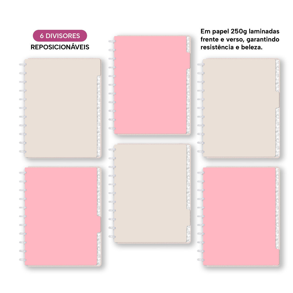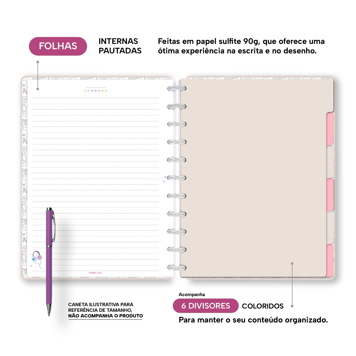 A capa é dura, com impressão digital de alta definição, e acompanha 4 ou 6 lindas divisórias que você pode colocar em qualquer local do caderno, funcionando como o guia perfeito para sua organização.