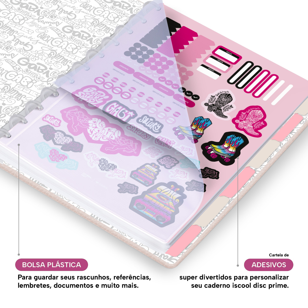Além de tudo isso, o Iscool Disc Prime conta com detalhes que fazem toda a diferença: elástico para fechamento da capa — muito mais estilo e privacidade para suas anotações —, bolsa plástica para guardar seus rascunhos, referências, lembretes, documentos, e uma cartela de adesivos incríveis, para que você possa personalizar seu caderno do seu jeitinho!