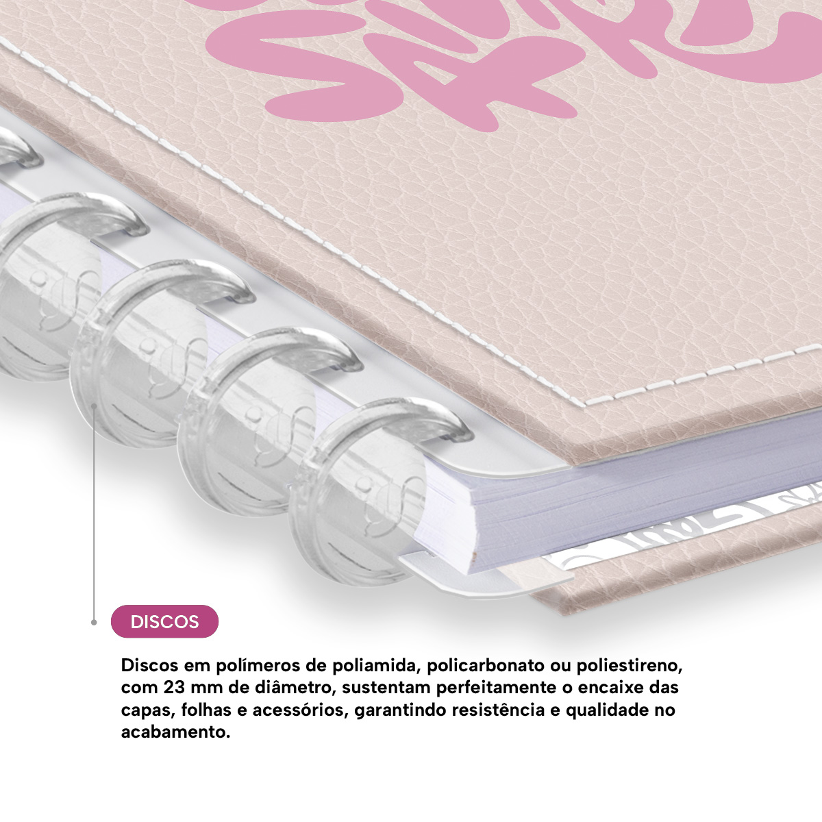 Encadernado com 9 ou 11 discos de 23mm ou 32mm em polímero de nylon e/ou policarbonato coloridos, fabricados no Brasil.