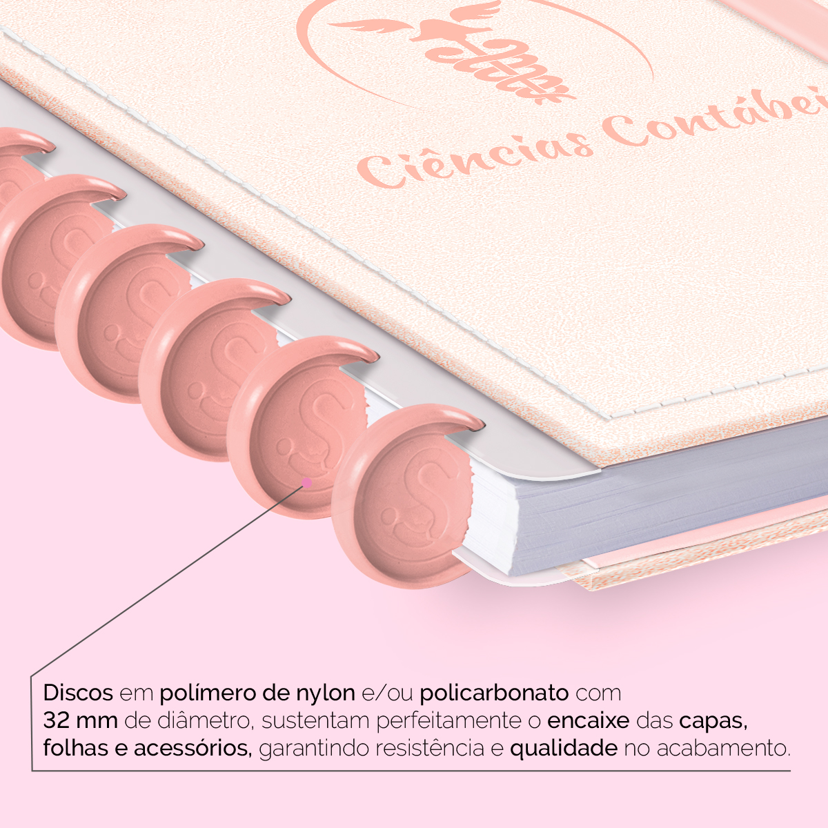 Encadernado com 11 discos G de 32mm em polímero de nylon e/ou policarbonato coloridos, fabricados no Brasil.