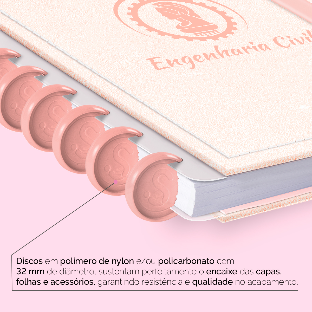 Encadernado com 11 discos G de 32mm em polímero de nylon e/ou policarbonato coloridos, fabricados no Brasil.