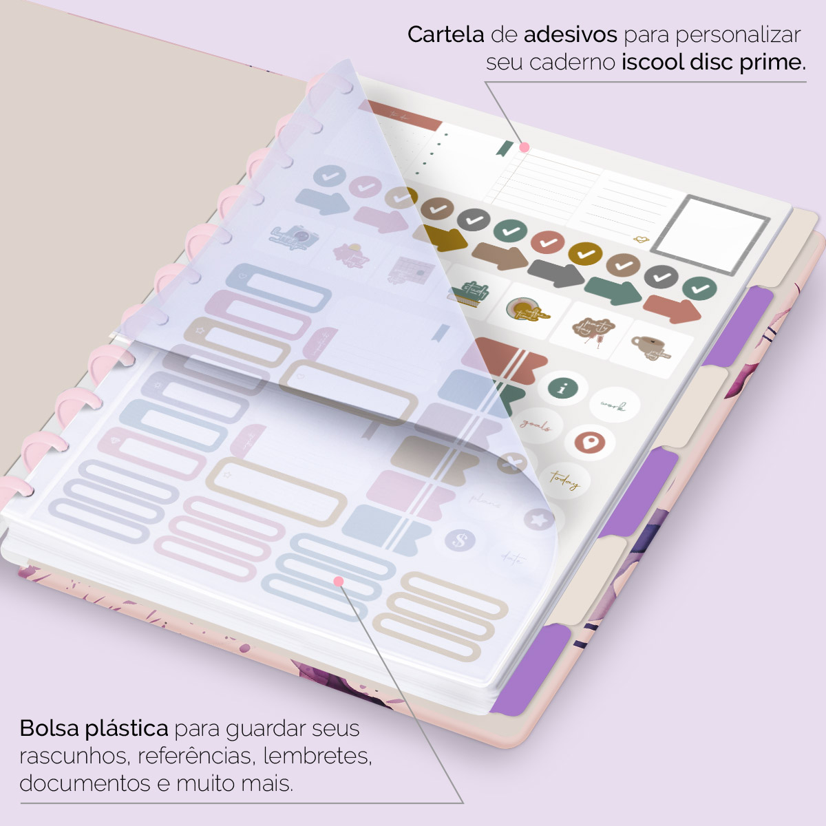 Além de tudo isso, o iscooldisc Prime Blackout, conta com detalhezinhos que fazem toda diferença: elástico para fechamento da capa, muito mais estilo e privacidade para suas anotações; bolsa plástica para guardar seus rascunhos, referências, lembretes, documentos e uma cartela de adesivos incríveis, para que você possa personalizar seu caderno do seu jeitinho!