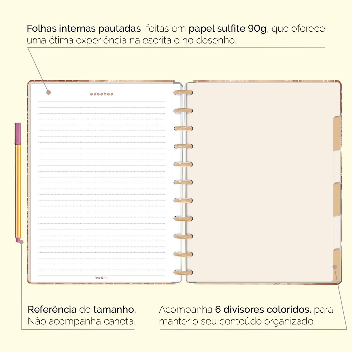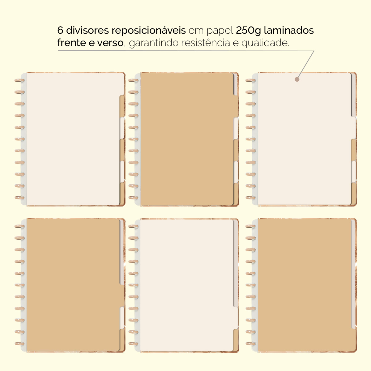A capa é dura com impressão digital de alta definição, acompanha 6 lindas divisórias que você pode colocar em qualquer local do caderno, funcionando como o guia perfeito para sua organização.