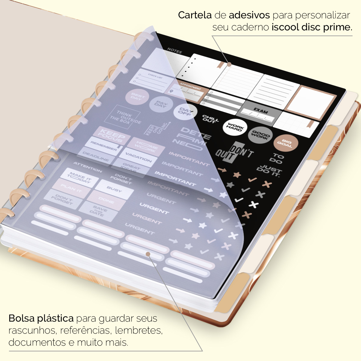 Além de tudo isso, o ISCOOL DISC PRIME UNIVERSITÁRIO, conta com detalhezinhos que fazem toda diferença: elástico para fechamento da capa, muito mais estilo e privacidade para suas anotações; bolsa plástica para guardar seus rascunhos, referências, lembretes, documentos e uma cartela de adesivos incríveis, para que você possa personalizar seu caderno do seu jeitinho!