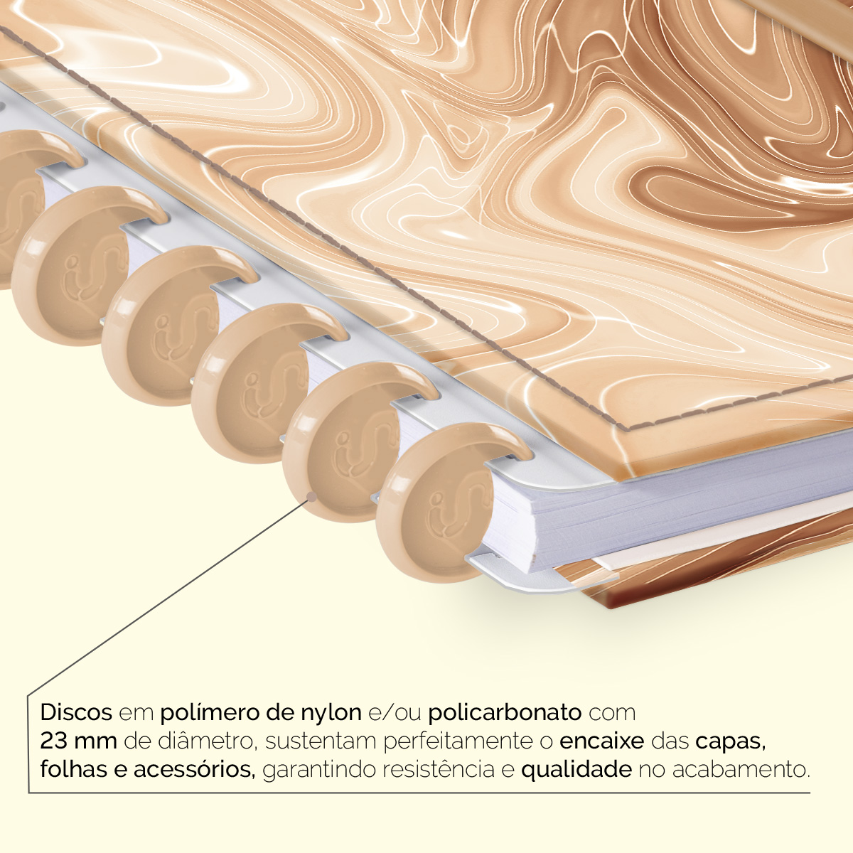 Encadernado com 11 discos G de 32mm em polímero de nylon e/ou policarbonato coloridos, fabricados no Brasil.