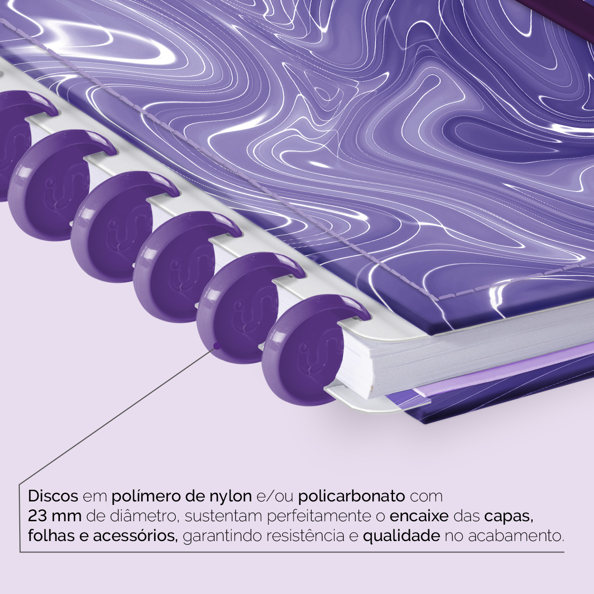 Encadernado com 11 discos G de 32mm em polímero de nylon e/ou policarbonato coloridos, fabricados no Brasil.