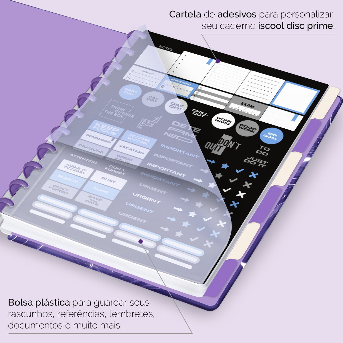 Além de tudo isso, o ISCOOL DISC PRIME UNIVERSITÁRIO, conta com detalhezinhos que fazem toda diferença: elástico para fechamento da capa, muito mais estilo e privacidade para suas anotações; bolsa plástica para guardar seus rascunhos, referências, lembretes, documentos e uma cartela de adesivos incríveis, para que você possa personalizar seu caderno do seu jeitinho!