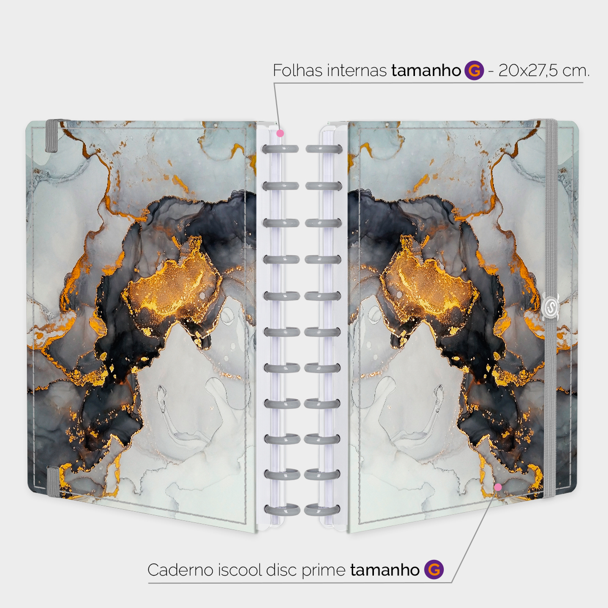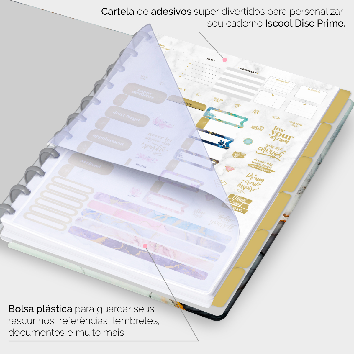 Além de tudo isso, o iscooldisc Prime Blackout, conta com detalhezinhos que fazem toda diferença: elástico para fechamento da capa, muito mais estilo e privacidade para suas anotações; bolsa plástica para guardar seus rascunhos, referências, lembretes, documentos e uma cartela de adesivos incríveis, para que você possa personalizar seu caderno do seu jeitinho!