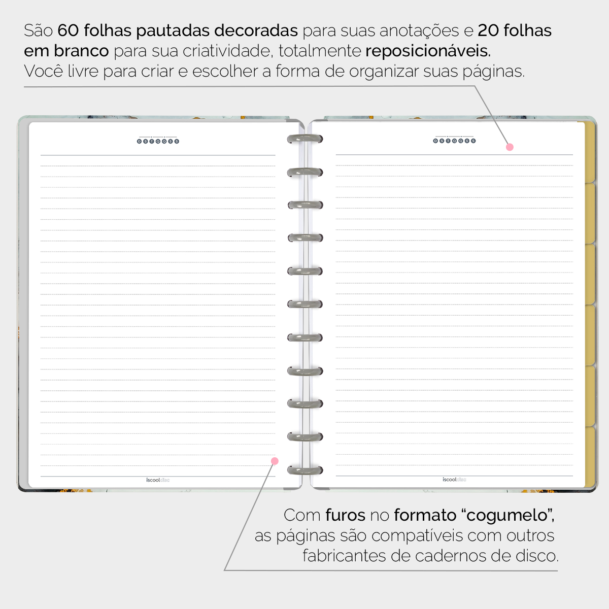 Com furos no formato de “cogumelo”, você poderá dar um “up” em seu caderno com nossos refis, além de ser compatível com outros fabricantes de cadernos de discos.