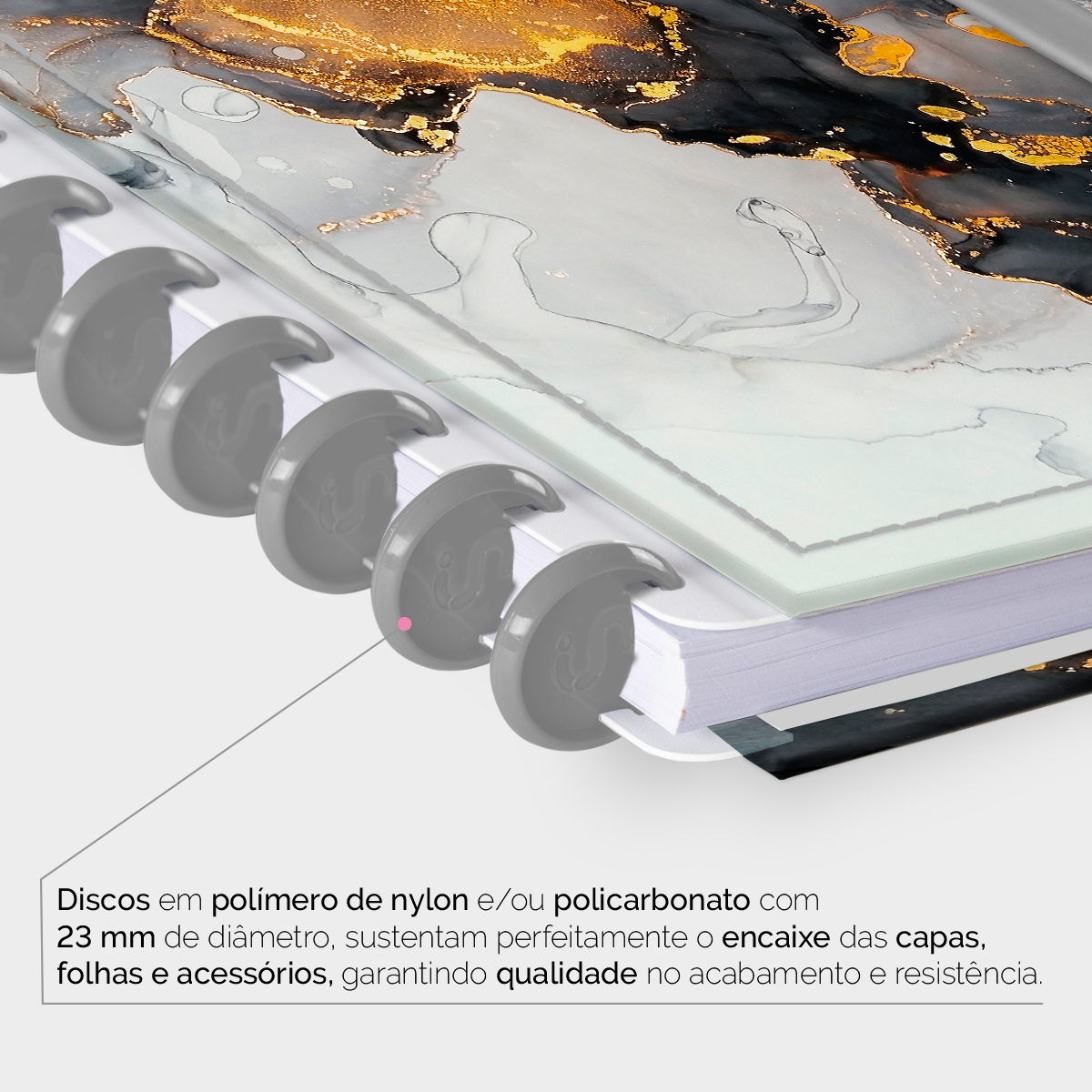 Encadernado com 11 discos M de 23mm em polímero de nylon e/ou policarbonato, fabricados no Brasil.