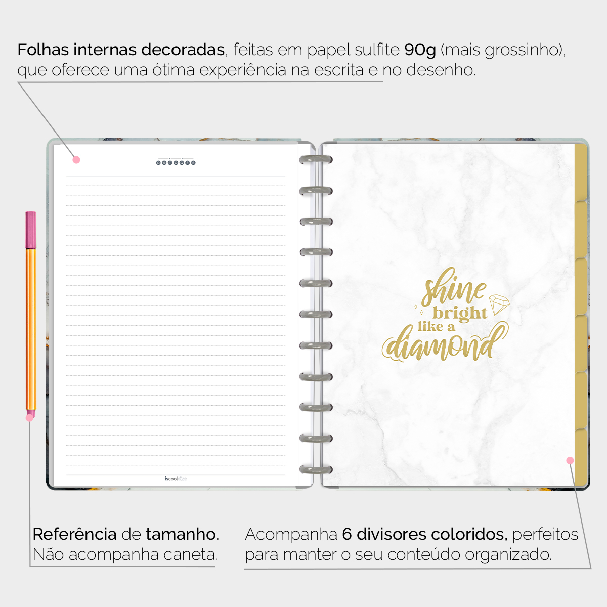 A capa é dura com impressão digital de alta definição, acompanha 6 lindas divisórias que você pode colocar em qualquer local do caderno, funcionando como o guia perfeito para sua organização.