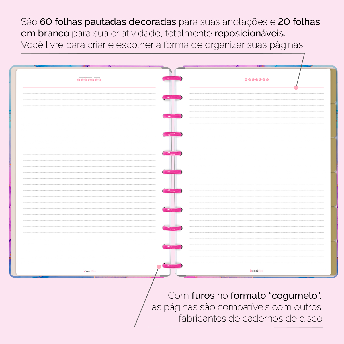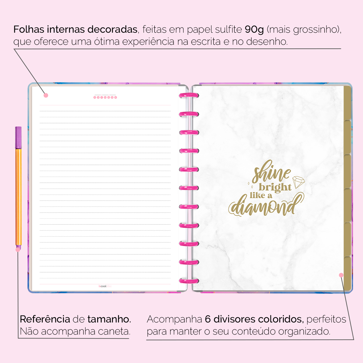 A capa é dura com impressão digital de alta definição, acompanha 6 lindas divisórias que você pode colocar em qualquer local do caderno, funcionando como o guia perfeito para sua organização.