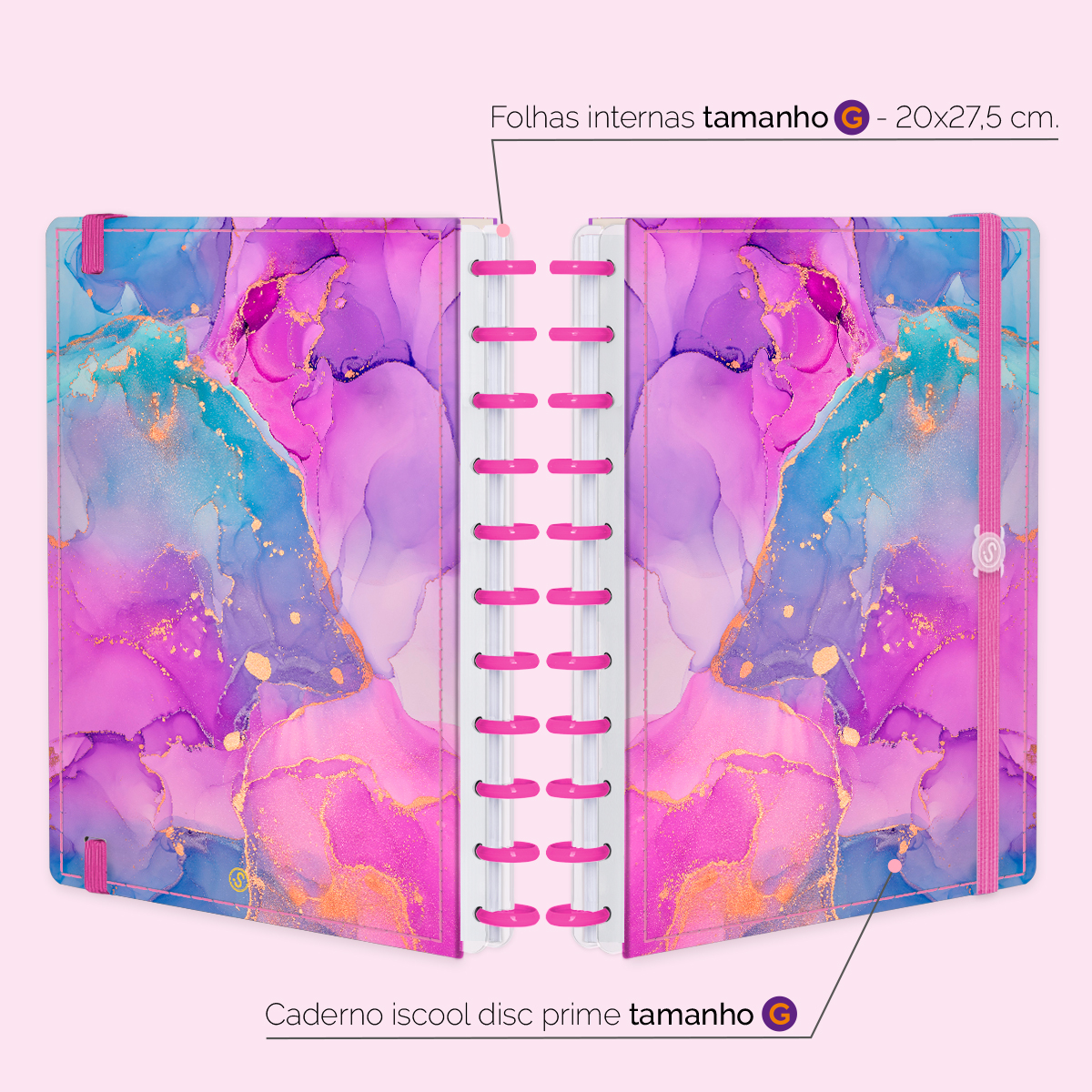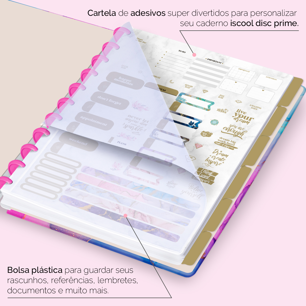 Além de tudo isso, o iscooldisc Prime Blackout, conta com detalhezinhos que fazem toda diferença: elástico para fechamento da capa, muito mais estilo e privacidade para suas anotações; bolsa plástica para guardar seus rascunhos, referências, lembretes, documentos e uma cartela de adesivos incríveis, para que você possa personalizar seu caderno do seu jeitinho!