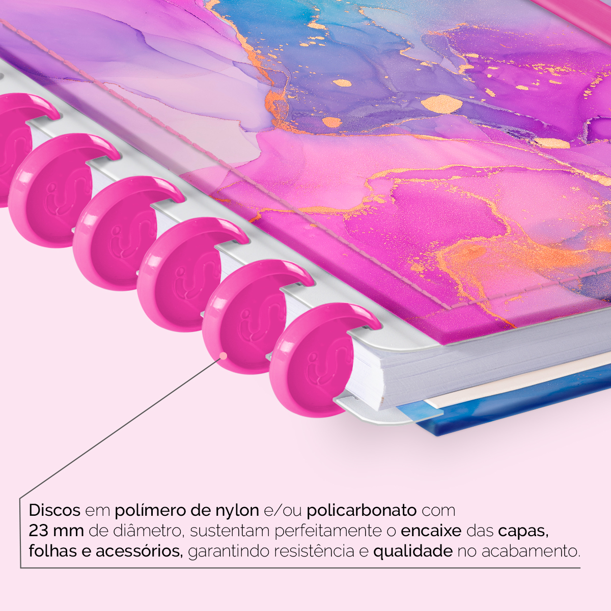 Encadernado com 11 discos M de 23mm em polímero de nylon e/ou policarbonato, fabricados no Brasil.