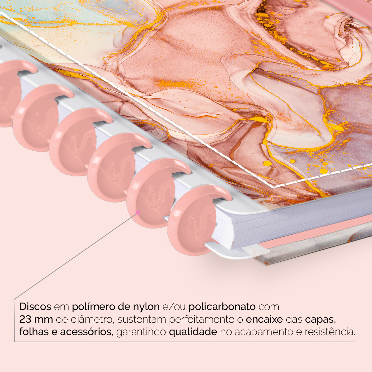 Encadernado com 11 discos M de 23mm em polímero de nylon e/ou policarbonato, fabricados no Brasil.