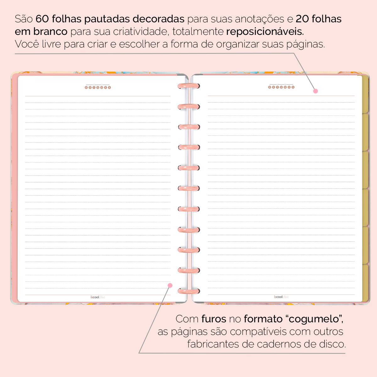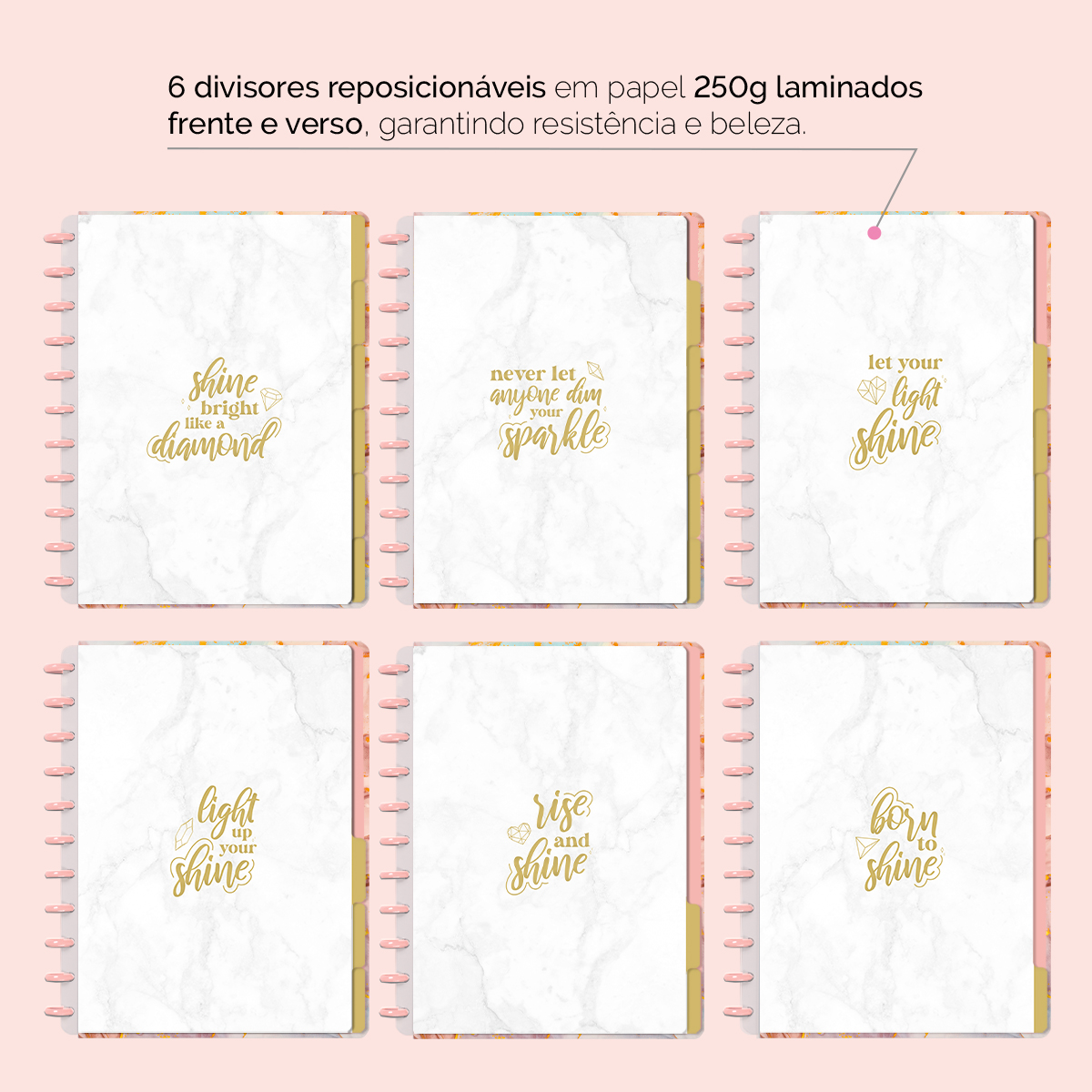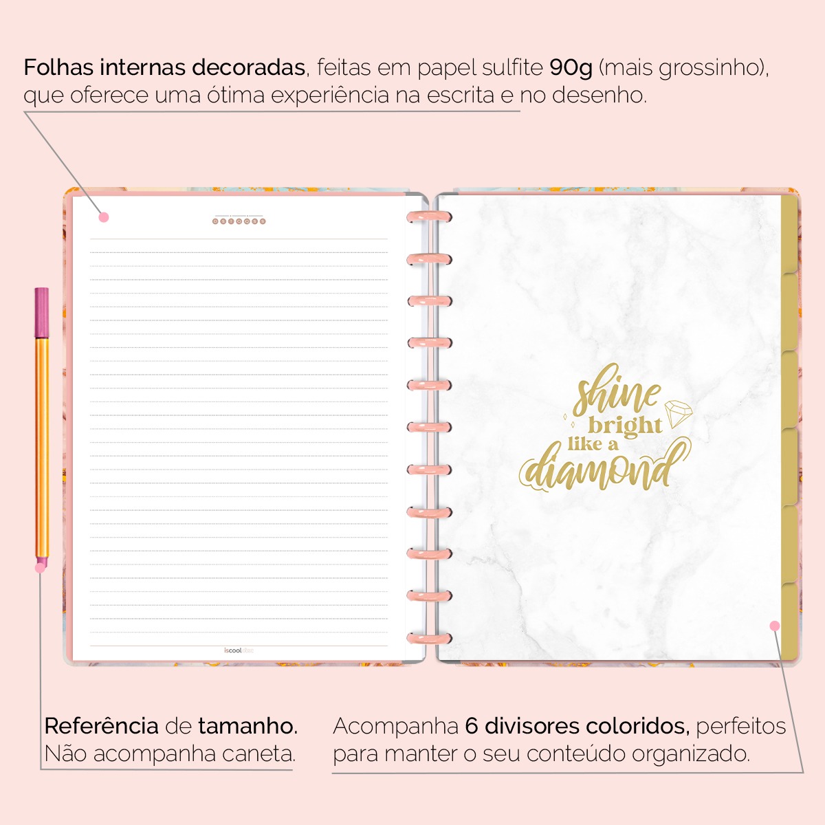 A capa é dura com impressão digital de alta definição, acompanha 6 lindas divisórias que você pode colocar em qualquer local do caderno, funcionando como o guia perfeito para sua organização.