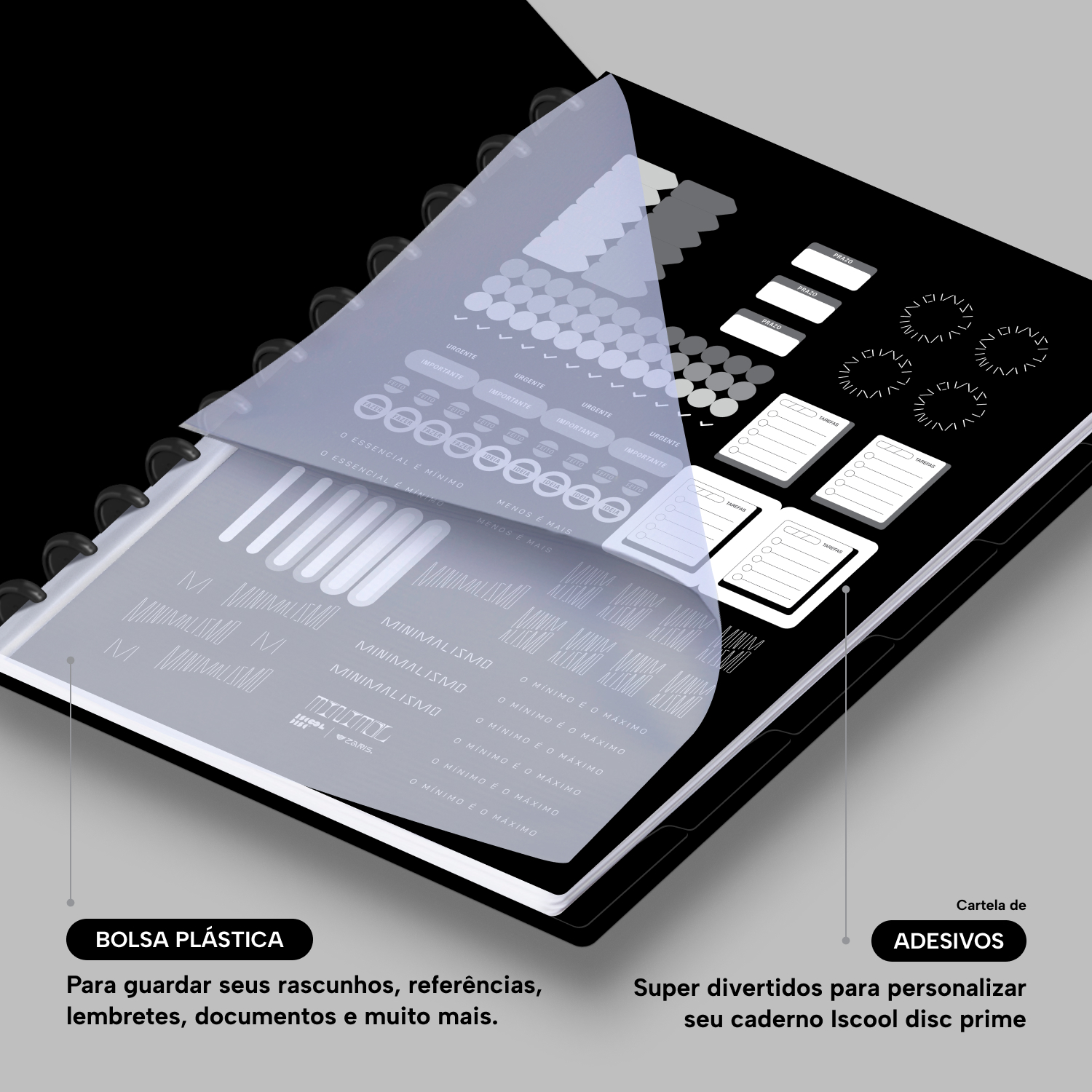 Além de tudo isso, o iscooldisc Prime conta com detalhes que fazem toda a diferença: elástico para fechamento da capa, muito mais estilo e privacidade para suas anotações; bolsa plástica para guardar seus rascunhos, referências, lembretes, documentos e uma cartela de adesivos incríveis, para que você possa personalizar seu caderno do seu jeitinho!