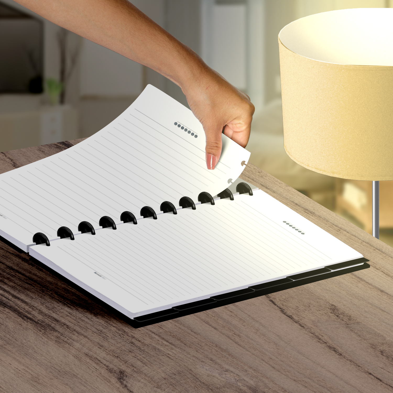 Com furos no formato de “cogumelo”, você poderá dar um “up” em seu caderno com nossos refis, além de ser compatível com outros fabricantes de cadernos de discos.