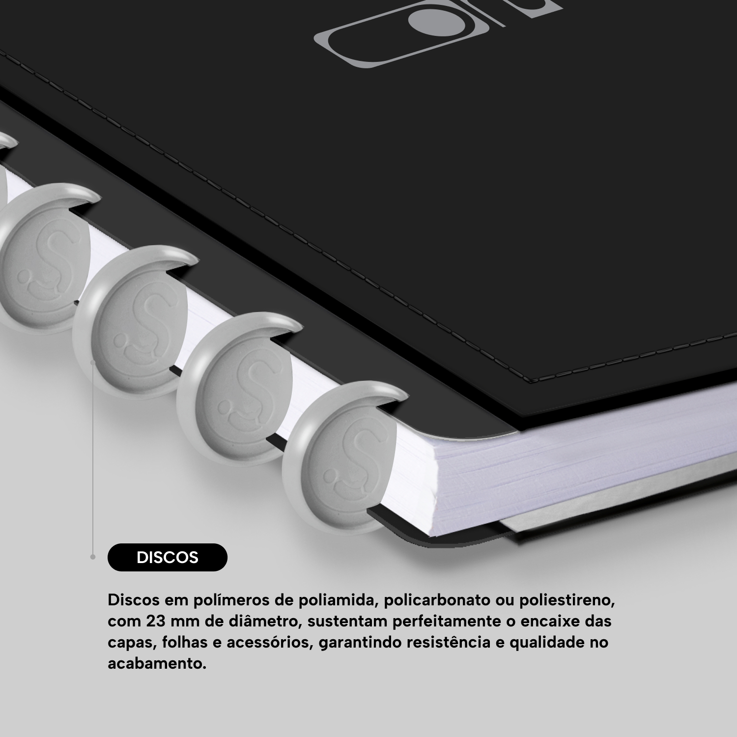 Os nossos discos são fabricados em polímero de nylon e/ou policarbonato. Podem ser substituídos, proporcionando imensa variedade na combinação das cores, qualidade no acabamento e eficácia no encaixe das capas, folhas e acessórios.