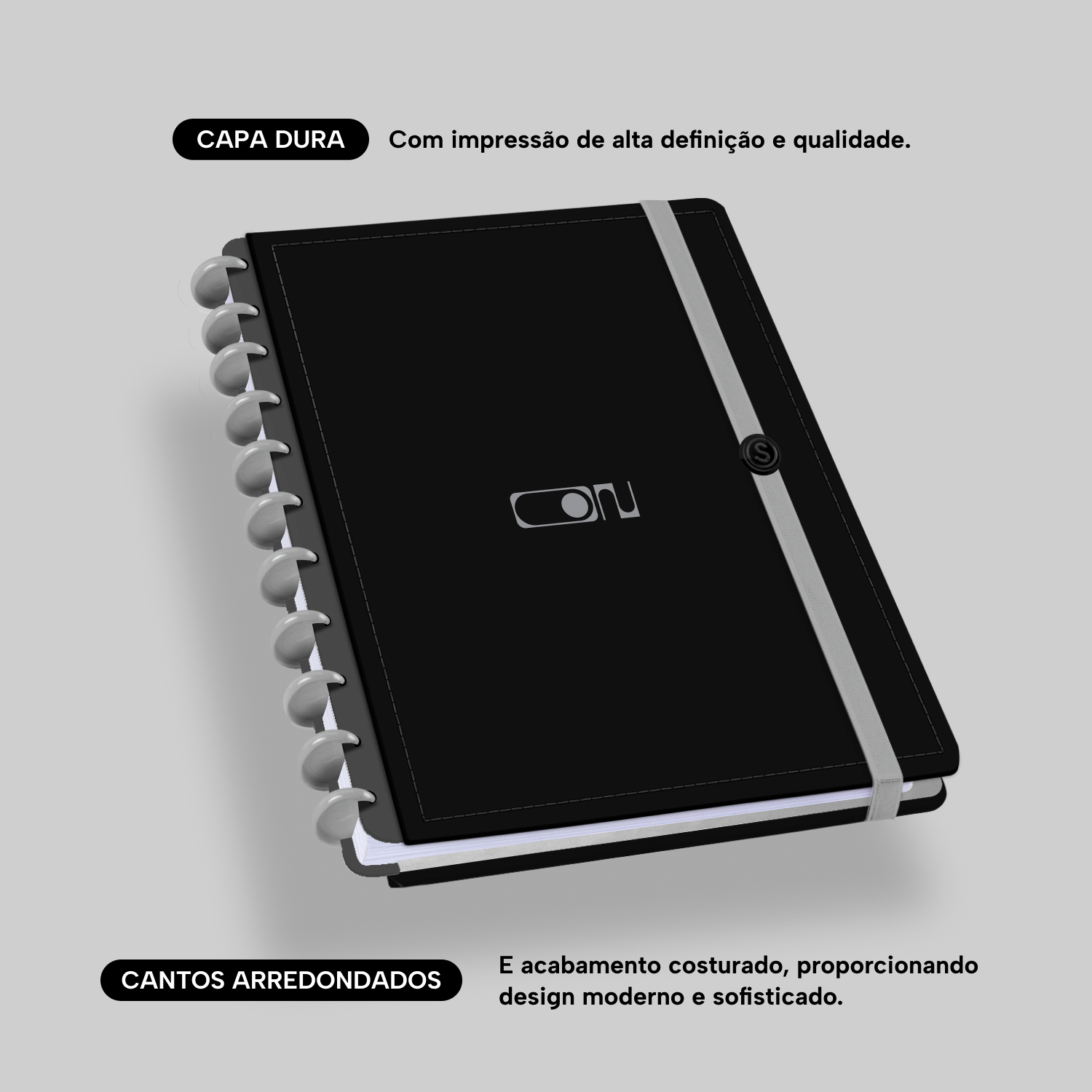 Encadernado com 11 discos M de 23mm em polímero de nylon e/ou policarbonato coloridos, fabricados no Brasil.