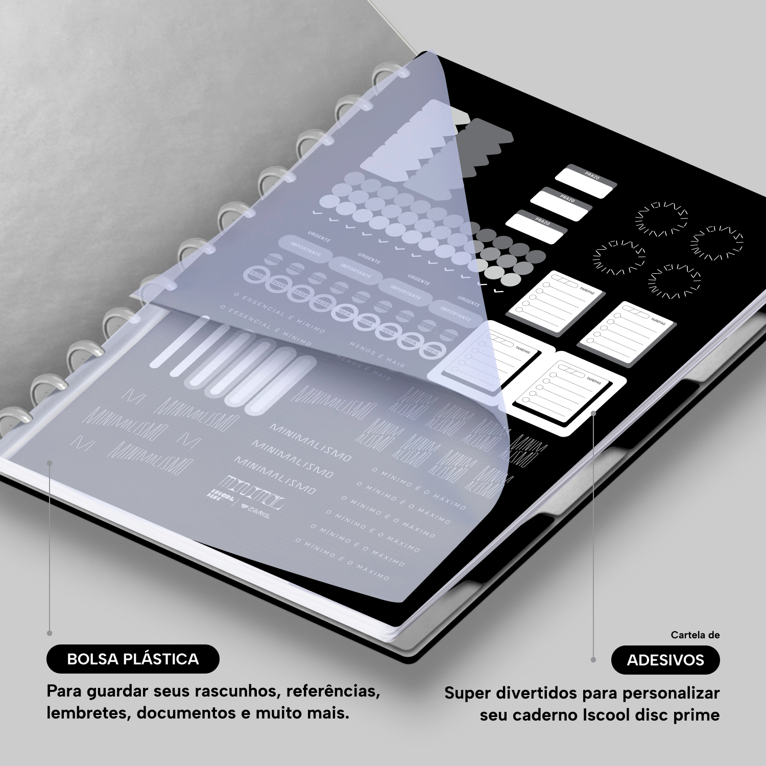 Além de tudo isso, o iscooldisc Prime conta com detalhes que fazem toda a diferença: elástico para fechamento da capa, muito mais estilo e privacidade para suas anotações; bolsa plástica para guardar seus rascunhos, referências, lembretes, documentos e uma cartela de adesivos incríveis, para que você possa personalizar seu caderno do seu jeitinho!