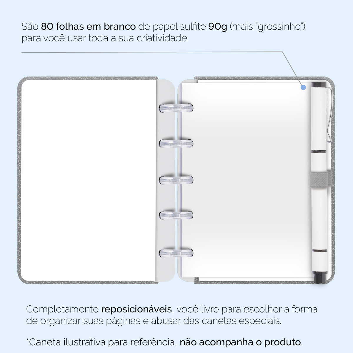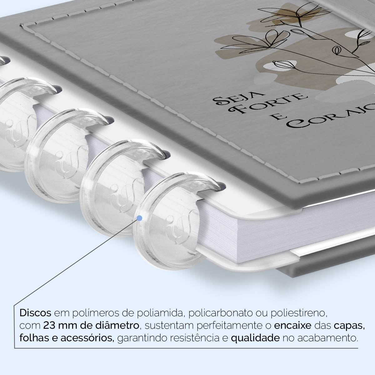 Encadernado com 11 discos M de 23mm em polímero de nylon e/ou policarbonato, fabricados no Brasil.