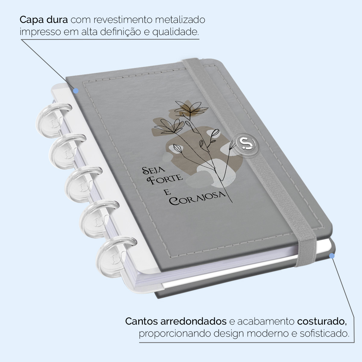 A capa é dura com impressão digital de alta definição, acompanha 6 lindas divisórias que você pode colocar em qualquer local do caderno, funcionando como o guia perfeito para sua organização.