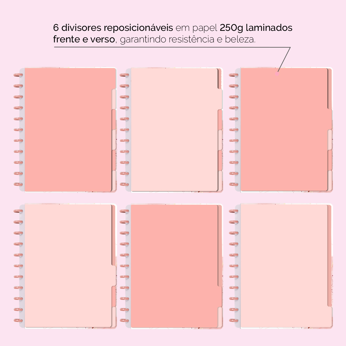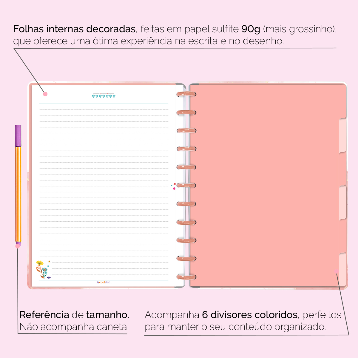A capa é dura com impressão digital de alta definição, acompanha 6 lindas divisórias que você pode colocar em qualquer local do caderno, funcionando como o guia perfeito para sua organização.