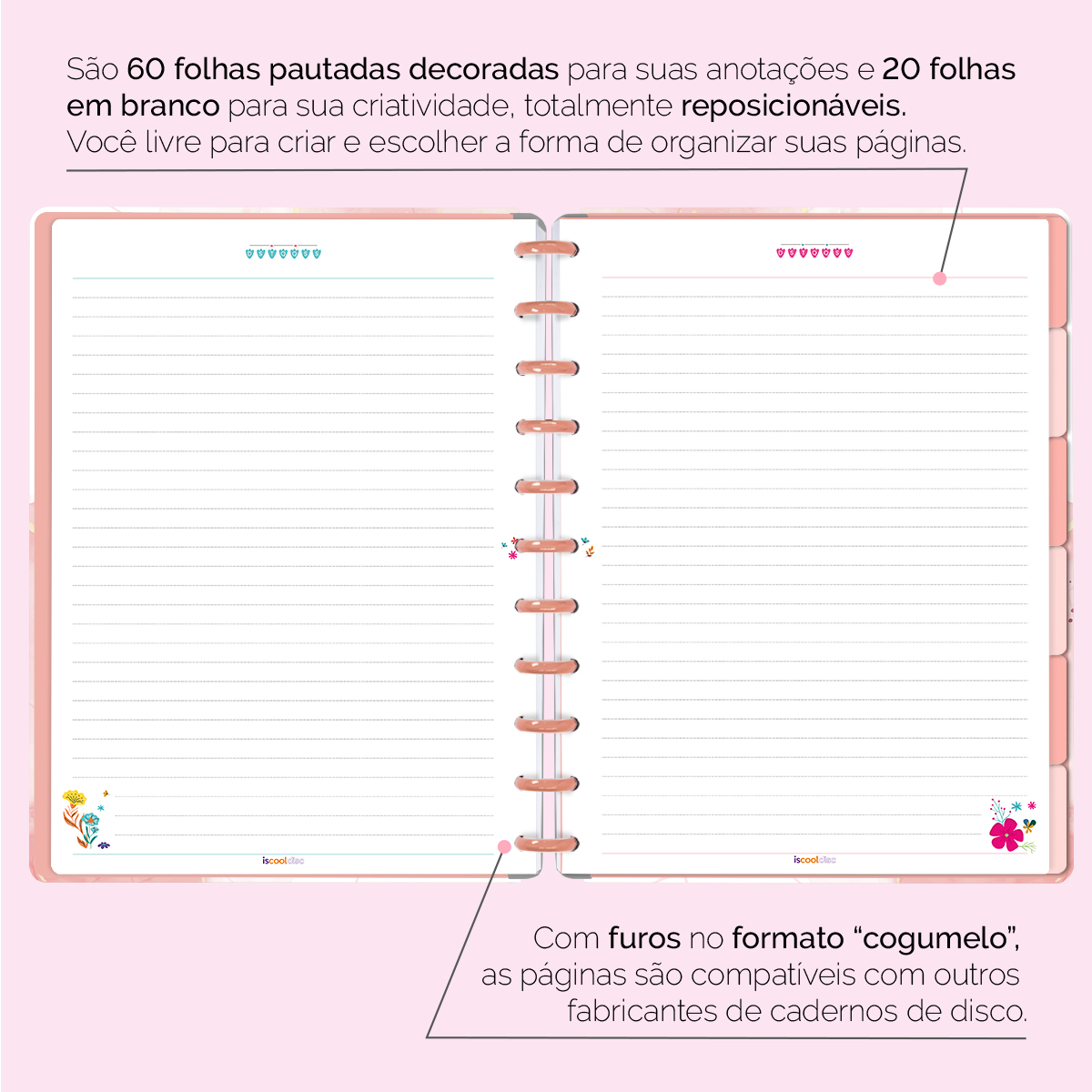 Com furos no formato de “cogumelo”, você poderá dar um “up” em seu caderno com nossos refis, além de ser compatível com outros fabricantes de cadernos de discos.