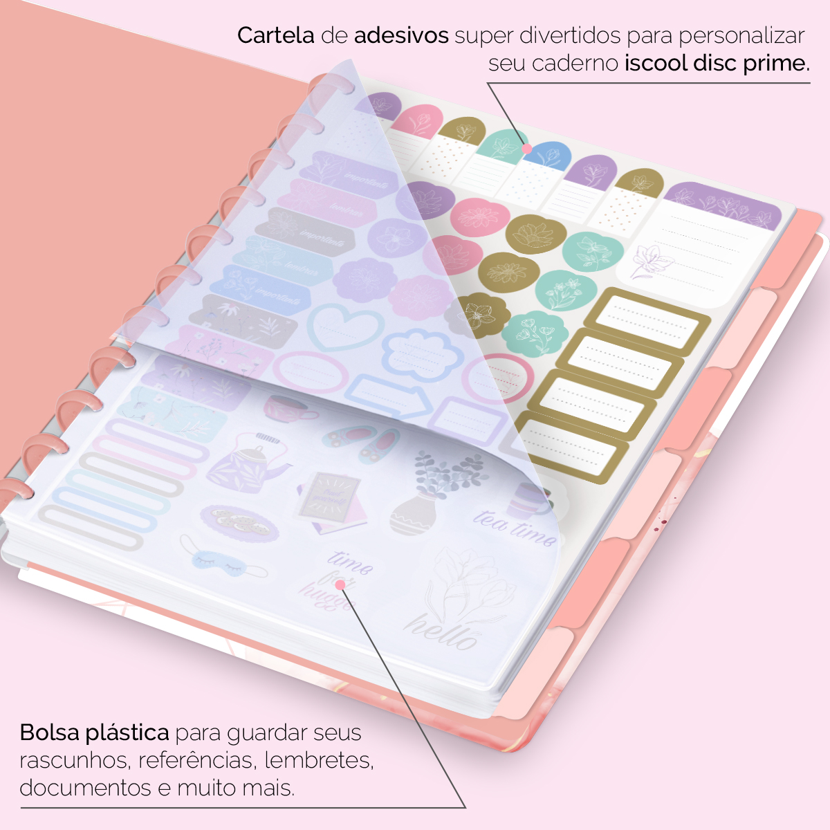 Além de tudo isso, o ISCOOL DISC PRIME UNIVERSITÁRIO, conta com detalhezinhos que fazem toda diferença: elástico para fechamento da capa, muito mais estilo e privacidade para suas anotações; bolsa plástica para guardar seus rascunhos, referências, lembretes, documentos e uma cartela de adesivos incríveis, para que você possa personalizar seu caderno do seu jeitinho!