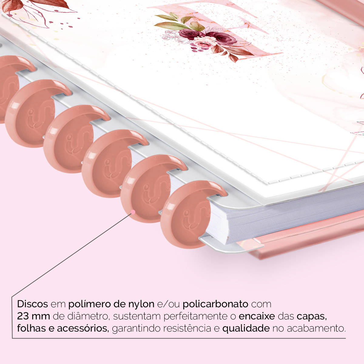 Os nossos discos são fabricados em polímero de nylon e/ou policarbonato, podem ser substituídos, proporcionando imensa variedade na combinação das cores, qualidade no acabamento e eficácia no encaixe das capas, folhas e acessórios.