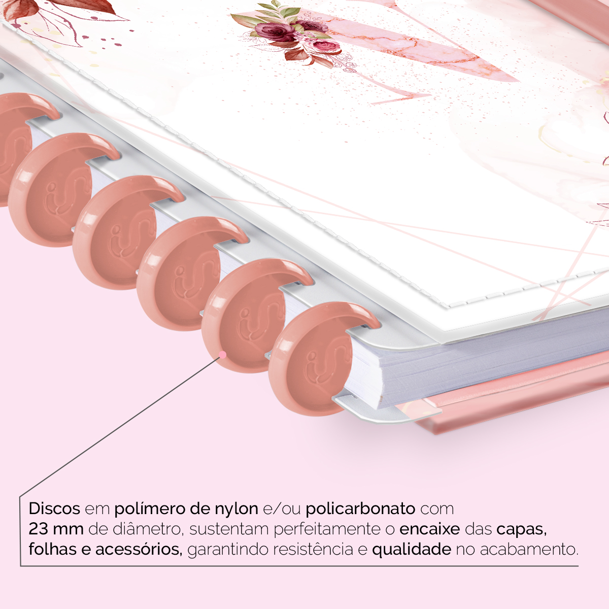 Encadernado com 11 discos M de 23mm em polímero de nylon e/ou policarbonato, fabricados no Brasil.