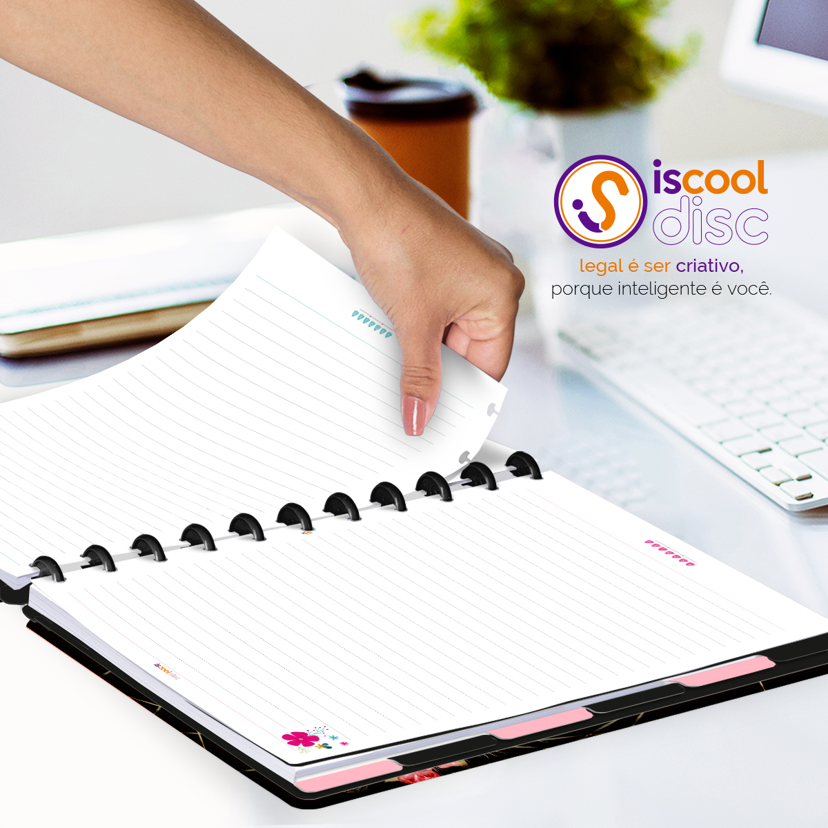 Além de tudo isso, o iscooldisc Prime Blackout, conta com detalhezinhos que fazem toda diferença: elástico para fechamento da capa, muito mais estilo e privacidade para suas anotações; bolsa plástica para guardar seus rascunhos, referências, lembretes, documentos e uma cartela de adesivos incríveis, para que você possa personalizar seu caderno do seu jeitinho!