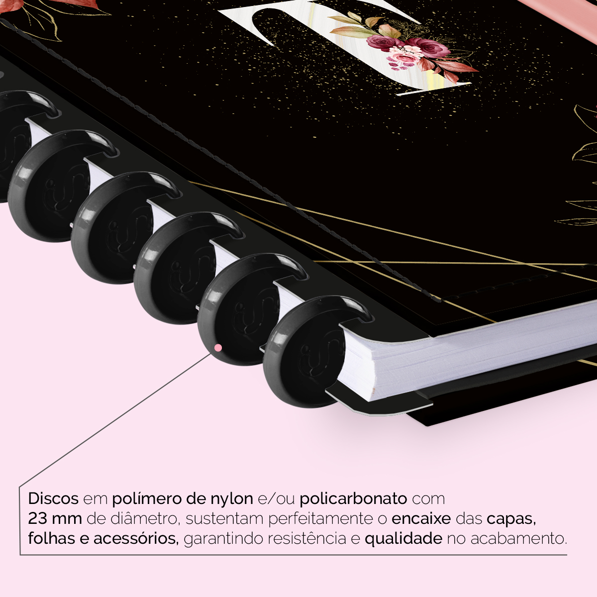Encadernado com 11 discos M de 23mm em polímero de nylon e/ou policarbonato, fabricados no Brasil.