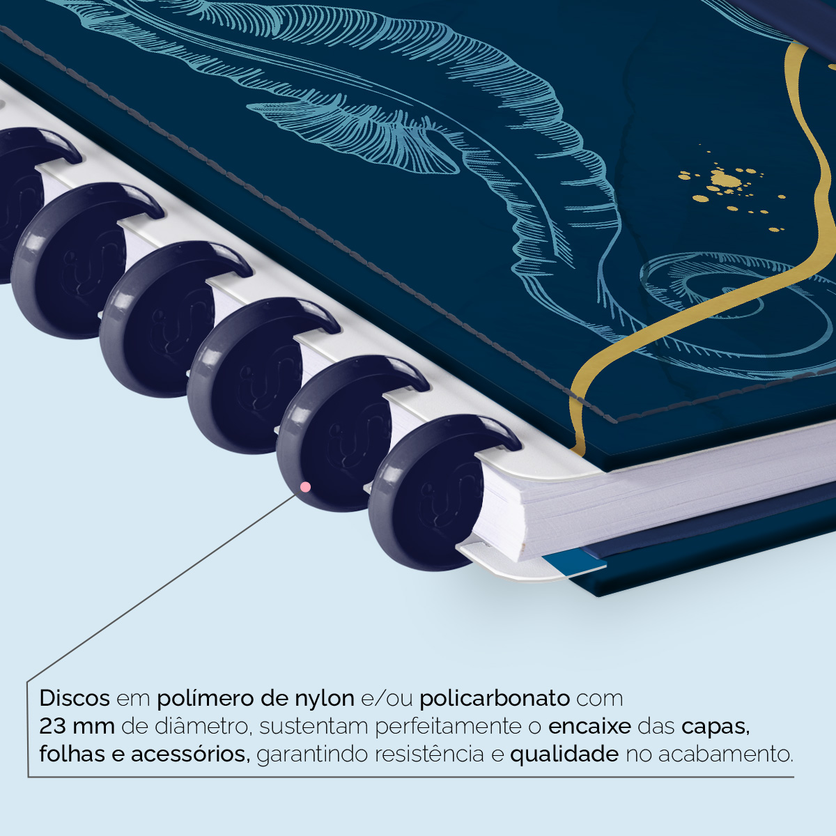 Encadernado com 11 discos M de 23mm em polímero de nylon e/ou policarbonato, fabricados no Brasil.