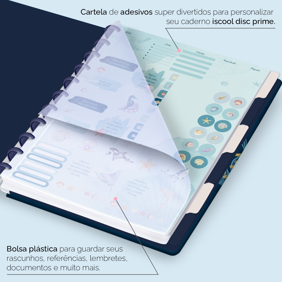 Além de tudo isso, o iscooldisc Prime Blackout, conta com detalhezinhos que fazem toda diferença: elástico para fechamento da capa, muito mais estilo e privacidade para suas anotações; bolsa plástica para guardar seus rascunhos, referências, lembretes, documentos e uma cartela de adesivos incríveis, para que você possa personalizar seu caderno do seu jeitinho!