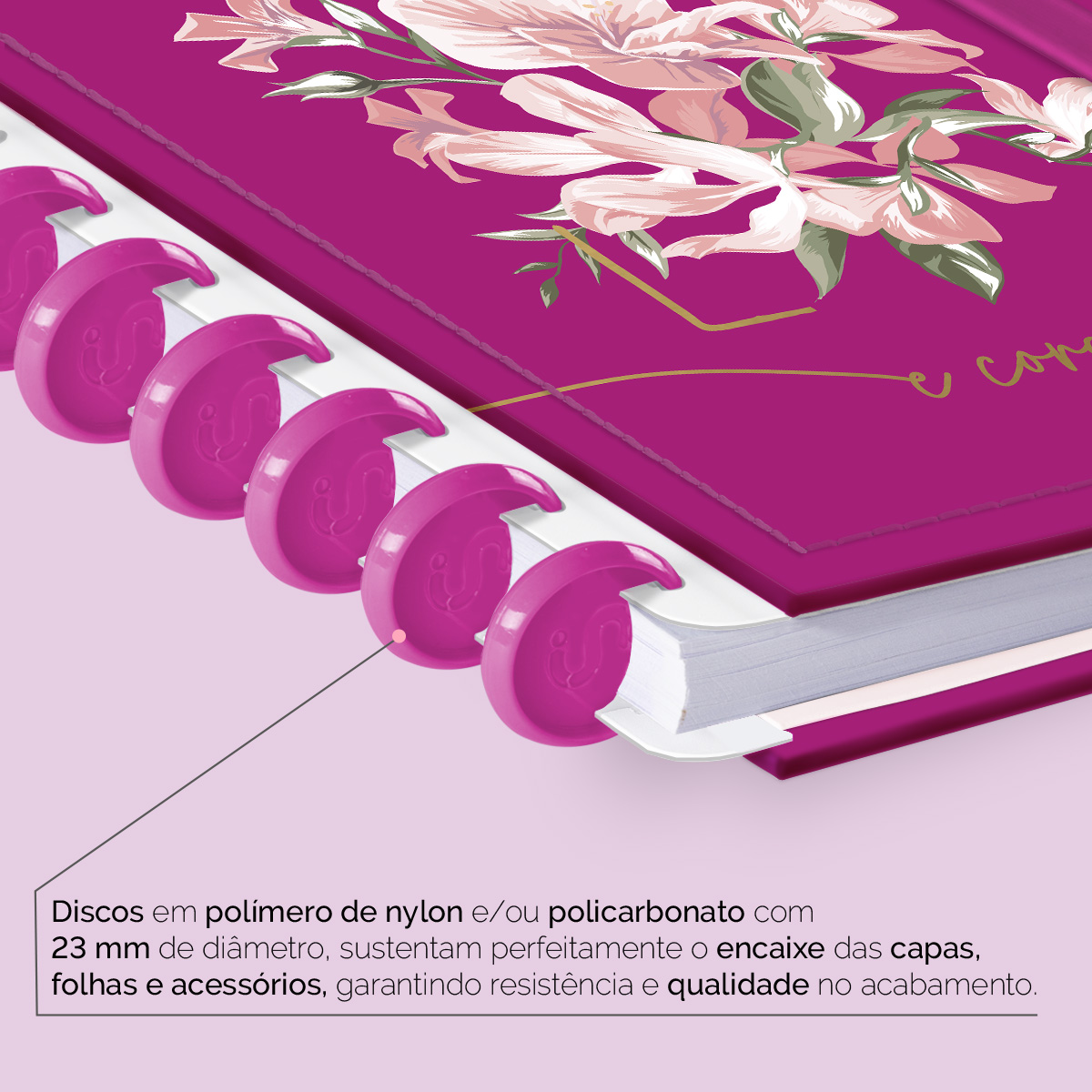 Encadernado com 11 discos M de 23mm em polímero de nylon e/ou policarbonato, fabricados no Brasil.