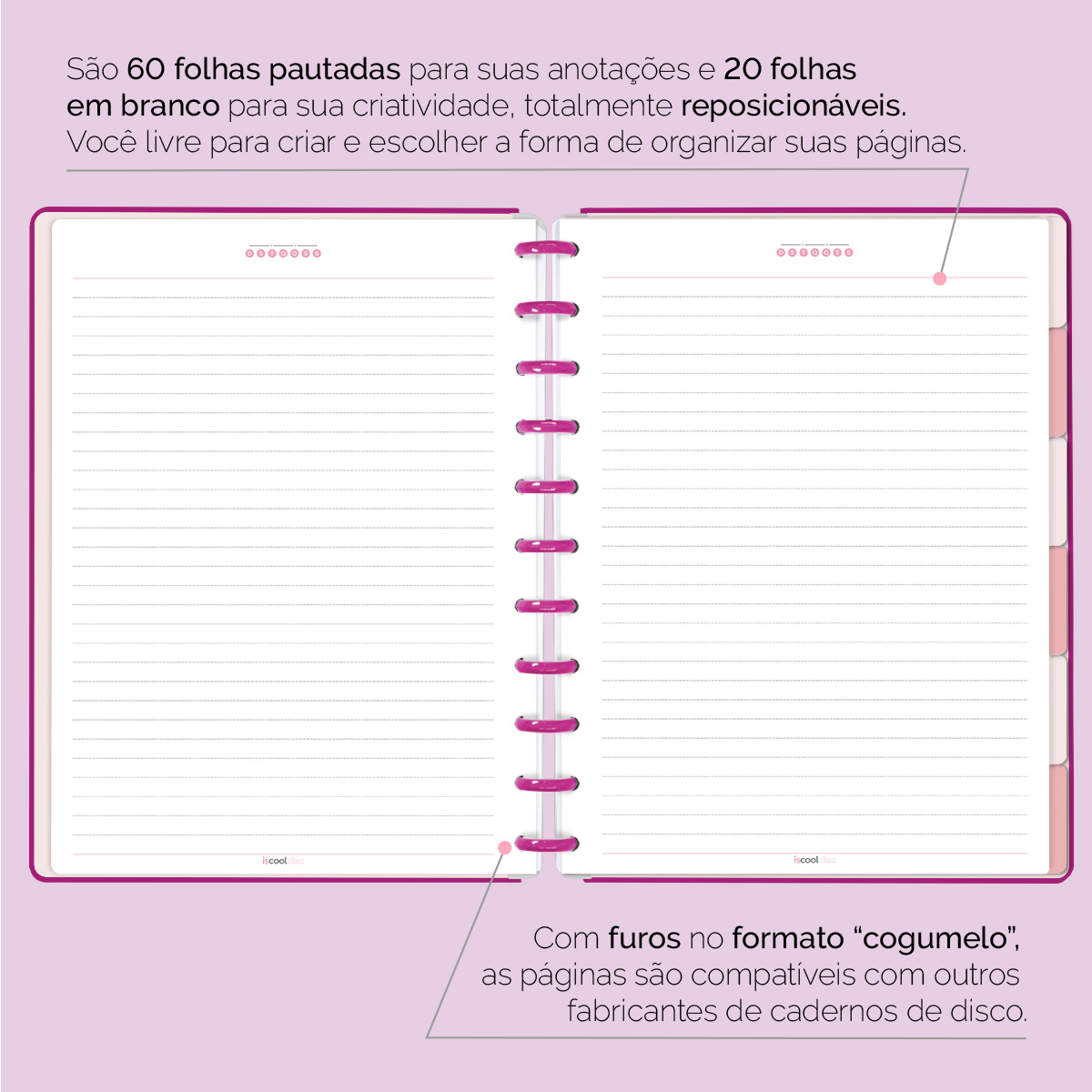 Com furos no formato de “cogumelo”, você poderá dar um “up” em seu caderno com nossos refis, além de ser compatível com outros fabricantes de cadernos de discos.