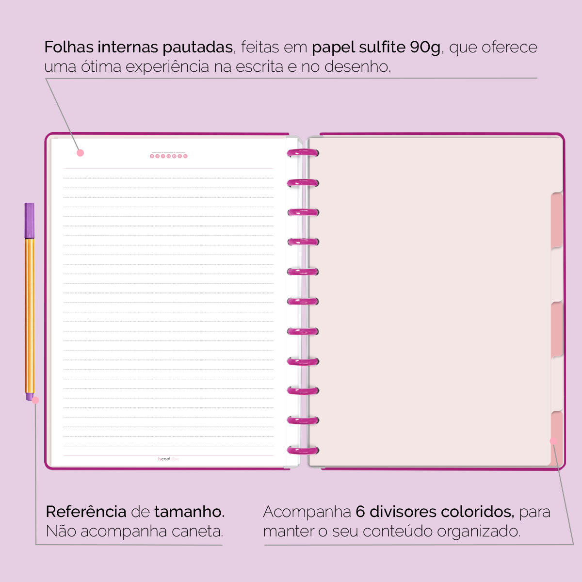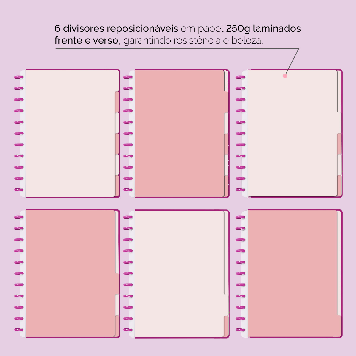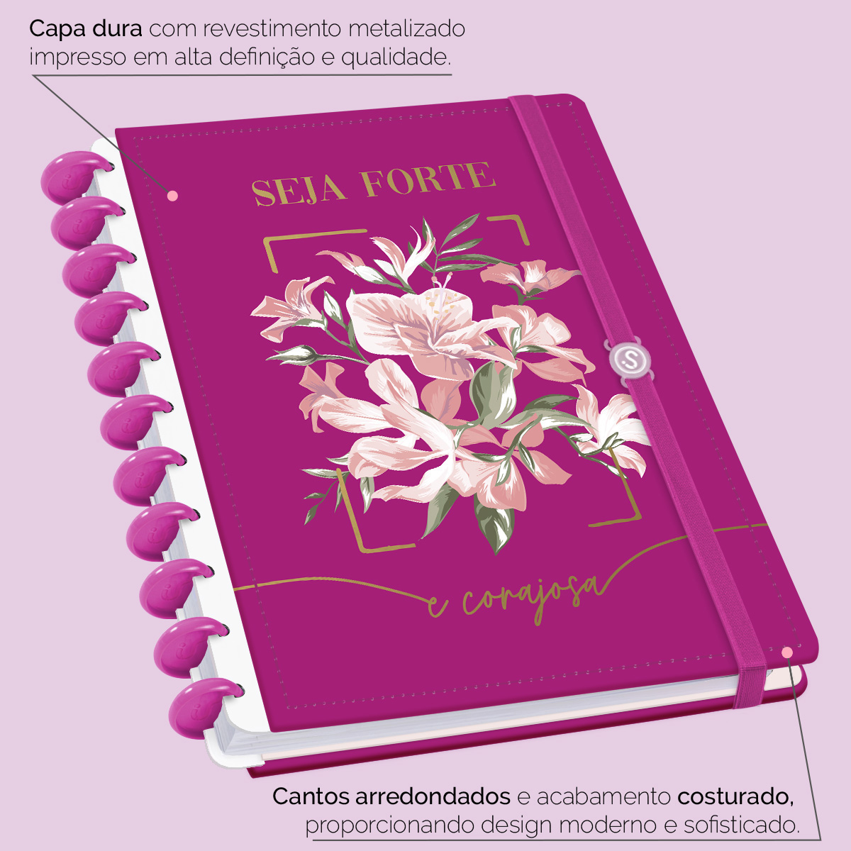 A capa é dura com impressão digital de alta definição, acompanha 6 lindas divisórias que você pode colocar em qualquer local do caderno, funcionando como o guia perfeito para sua organização.