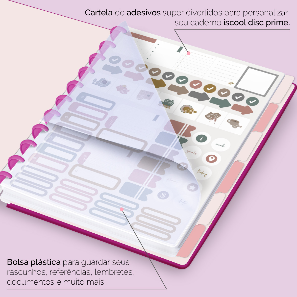 Além de tudo isso, o iscooldisc Prime Blackout, conta com detalhezinhos que fazem toda diferença: elástico para fechamento da capa, muito mais estilo e privacidade para suas anotações; bolsa plástica para guardar seus rascunhos, referências, lembretes, documentos e uma cartela de adesivos incríveis, para que você possa personalizar seu caderno do seu jeitinho!