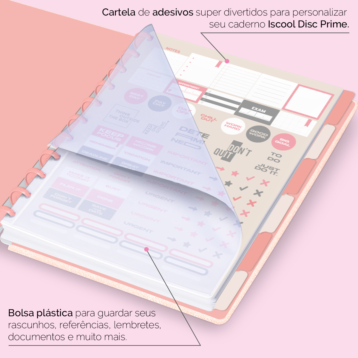 Além de tudo isso, o iscooldisc Prime Blackout, conta com detalhezinhos que fazem toda diferença: elástico para fechamento da capa, muito mais estilo e privacidade para suas anotações; bolsa plástica para guardar seus rascunhos, referências, lembretes, documentos e uma cartela de adesivos incríveis, para que você possa personalizar seu caderno do seu jeitinho!