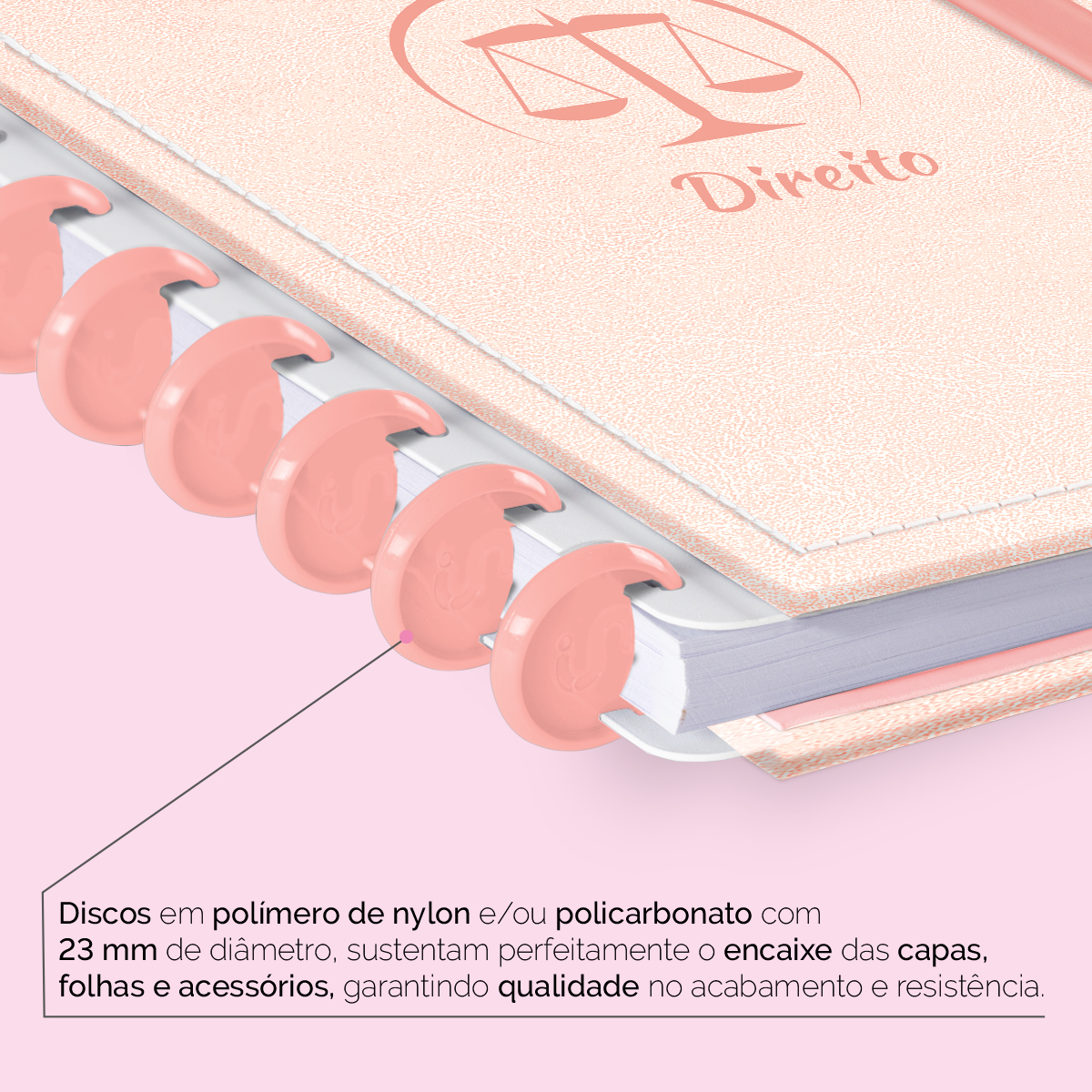 Encadernado com 11 discos M de 23mm em polímero de nylon e/ou policarbonato, fabricados no Brasil.