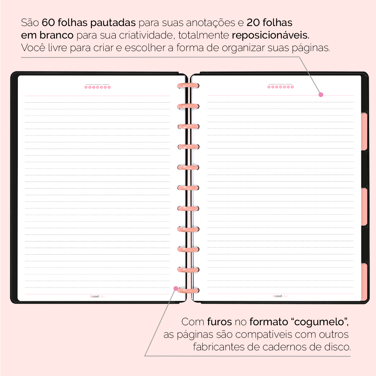 Com furos no formato de “cogumelo”, você poderá dar um “up” em seu caderno com nossos refis, além de ser compatível com outros fabricantes de cadernos de discos.