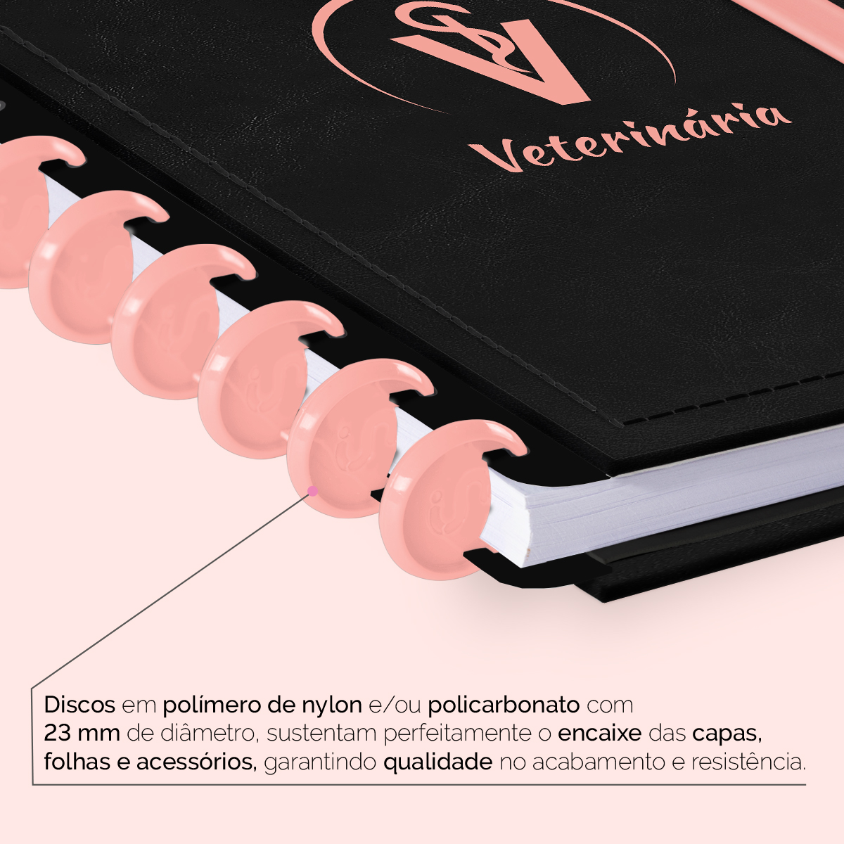 Encadernado com 11 discos M de 23mm em polímero de nylon e/ou policarbonato, fabricados no Brasil.