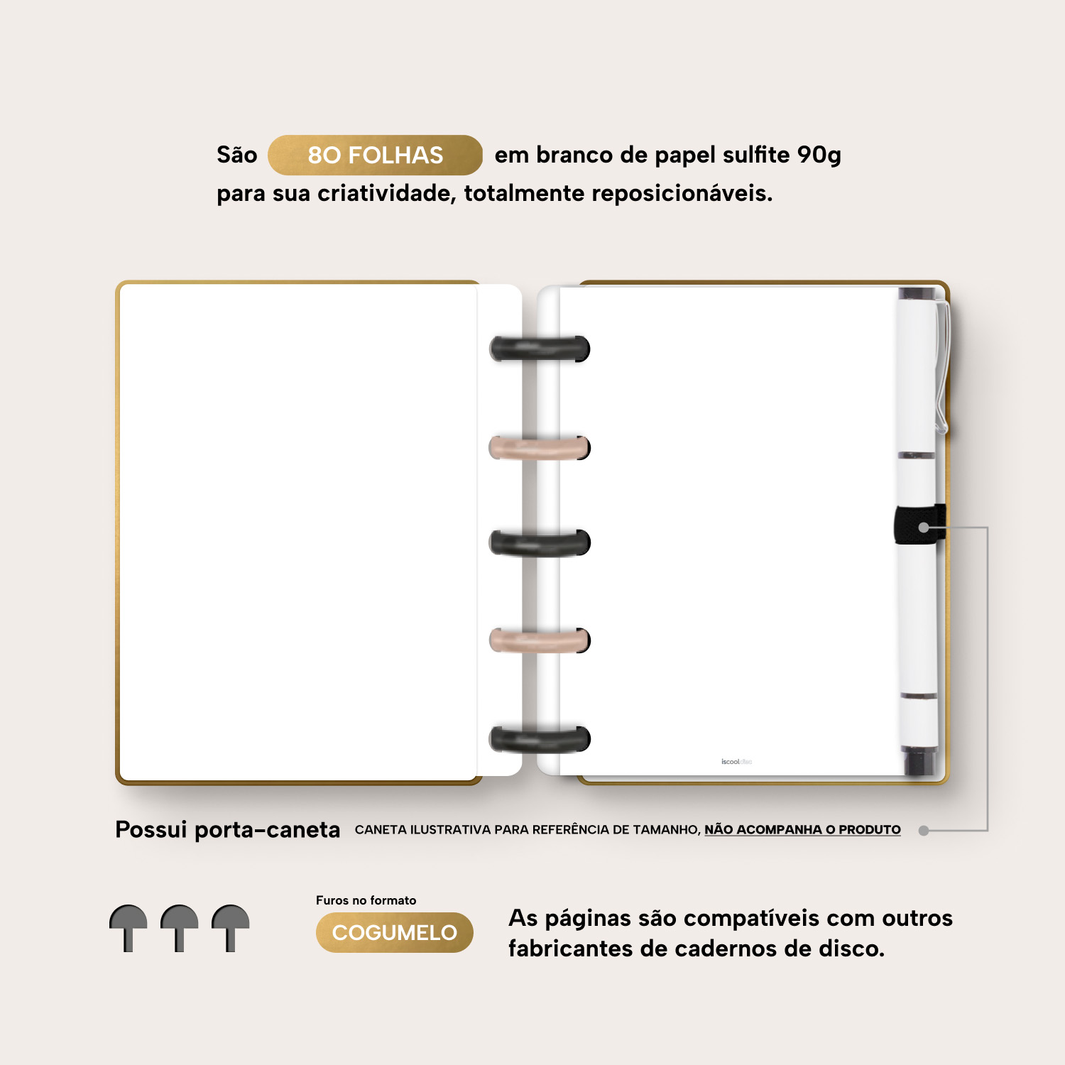 Um caderno totalmente customizável, no qual os elementos são reposicionáveis. Você pode montá-lo como preferir, deixando rolar solta toda a sua criatividade.
