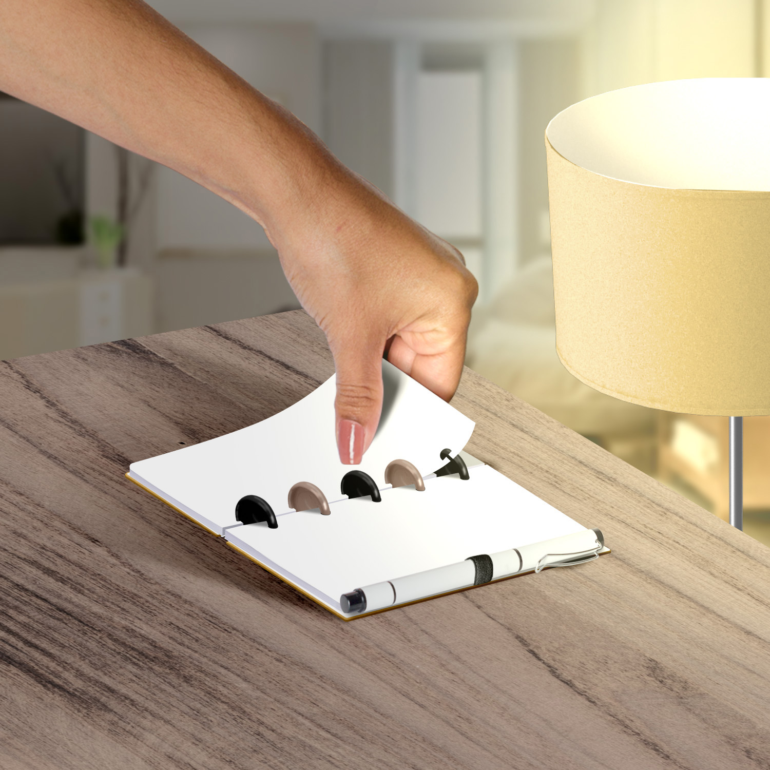 Encadernado com 11 discos M de 23mm em polímero de nylon e/ou policarbonato coloridos, fabricados no Brasil.