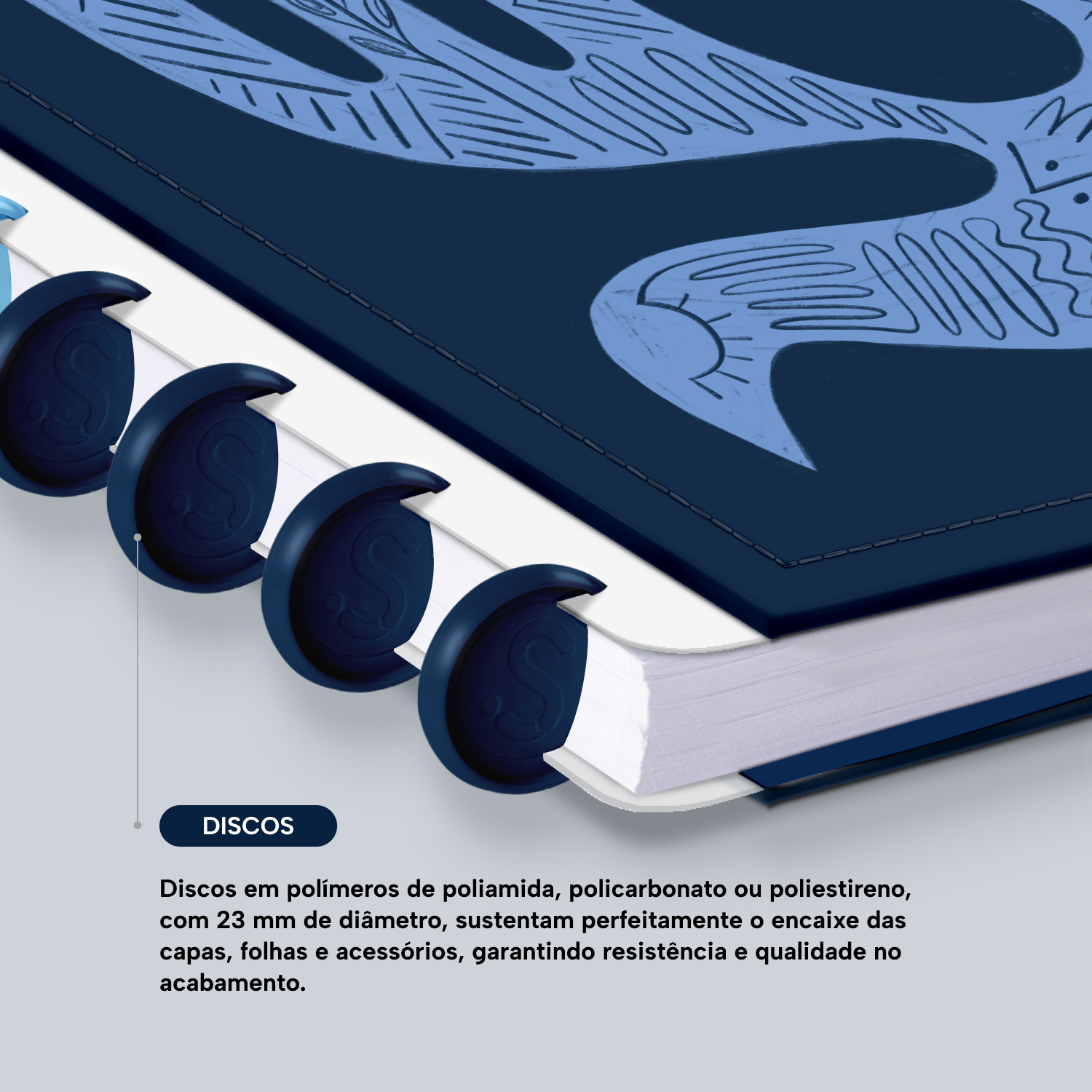 Os nossos discos são fabricados em polímero de nylon e/ou policarbonato. Podem ser substituídos, proporcionando imensa variedade na combinação das cores, qualidade no acabamento e eficácia no encaixe das capas, folhas e acessórios.